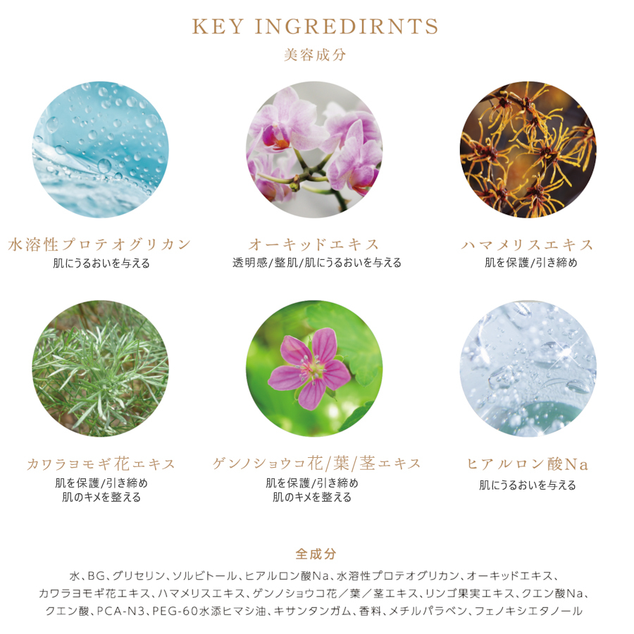 水、BG、グリセリン、ソルビトール、カワラヨモギ花エキス、ゲンノショウコ花/葉/茎エキス、オーキッドエキス、ヒアルロン酸Na、水溶性プロテオグリカン、ハマメリスエキス、リンゴ果実エキス、クエン酸Na、クエン酸、PCA-N3、PEG-60水添ヒマシ油、キサンタンガム、香料、メチルパラベン、フェノキシエタノール